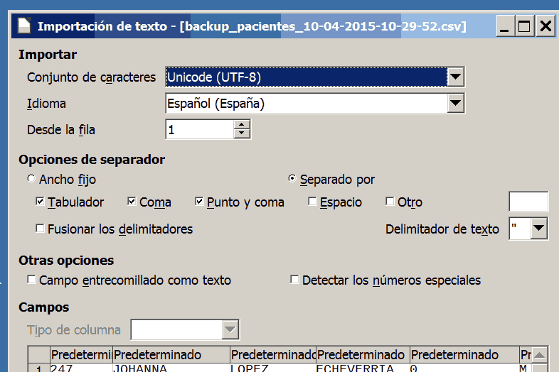 Para importar los datos con los códigos de codificación correctos lo mejor es descargar LibreOffice (también se puedehacer con Excell) que es gratuito y elegir el siguiente código de codificación: